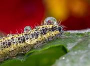 Nasturtium reflections in rain droplets on Large White caterpillar