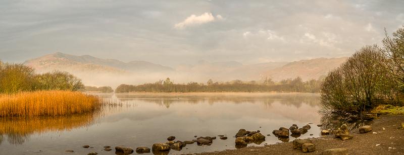 Sun trying to break through over Elter Water and the Langdale Pikes