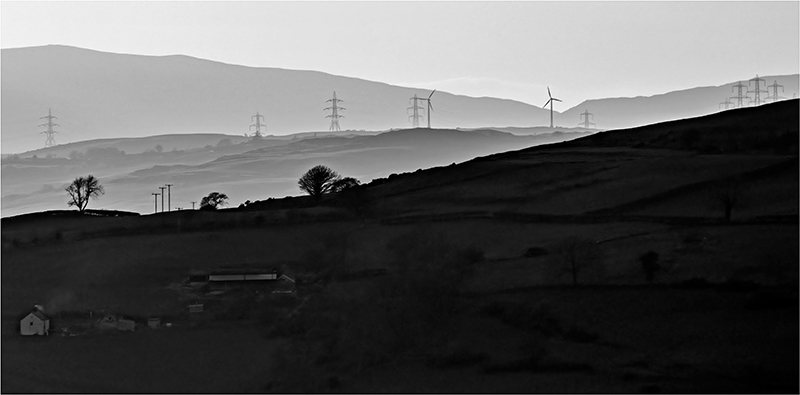 I like the story this appears to tell where it would seem as if the tradtional countryside is being plunged into darkness and the light future is a countryside covered in pylons, turbines etc. Interesting concept.