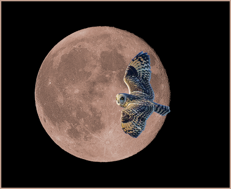 I captured the moon a few nights ago and have a more serious plan for this but thought I would just construct something for the critique group. If this was to be entered in a competition, it would have to be Open or Creative. Even so, it would be good to hear how it could be improved. While I did not want a silhouette, it might be improved if the Owl was much darker.