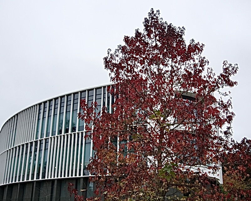 I was initially drawn to the image because I liked the colour and shape of the tree and the contrast with the building. The way I have framed the building is inspired by Des's photo last month. Unfortunately the weather was so poor that I did not manage to get the shot with an interesting sky before the leaves began to look less impressive so I did what I could.