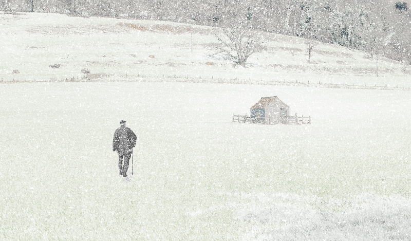 I do like the position of the man and the way he's looking in the direction of the barn, but he also doesn't seem well grounded somehow. Compositionally I think it works well, but there's a dark area in the top right and a dark vertical line top left (probably a tree) both of which are out of keeping with rest.
