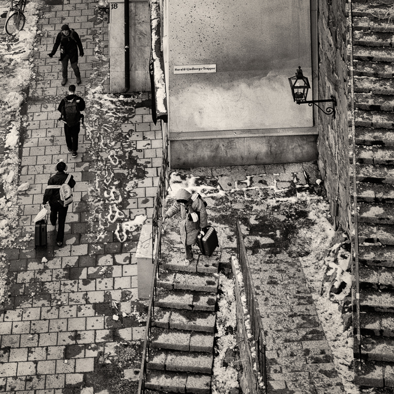These stairs look a little treacherous. I find I am looking around to see how they all link. A good use of B&W.